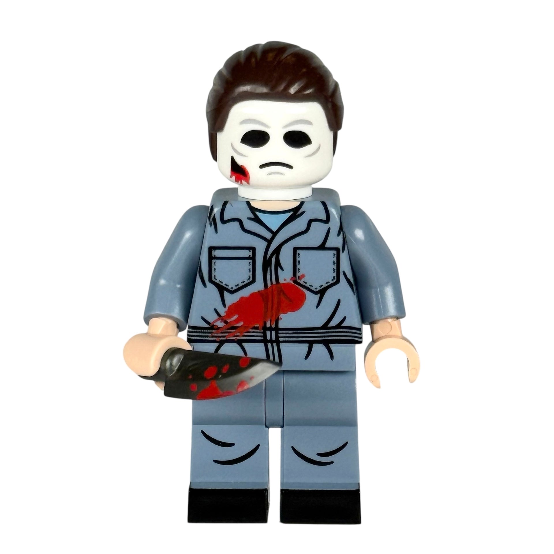 Includes: Custom Printed Minifigure, Customized LEGO Hair Piece, Custom Printed Knife made by Brickarms, 3" Vinyl Sticker